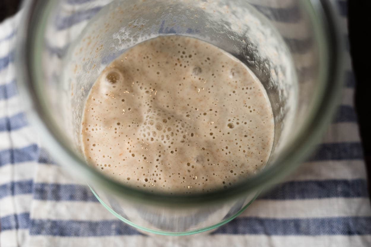 The key to coaxing out maximal fermentation with your starter is to be observant. Watch how it evolves throughout the day and note how long it takes to reach full ripeness: a strong sour aroma, a breakdown of the mixture, significant bubbles on top and at the sides. If it’s doing this too fast (for example, you refresh at 8 a.m., and it ripens at 2 p.m. when you’re at work), you can reduce the water temperature, change the ambient temperature, or reduce the amount of mature starter you carry over at each refreshment (this is what I do). You want to try to refresh your starter right when it’s at its peak ripeness or shortly thereafter.