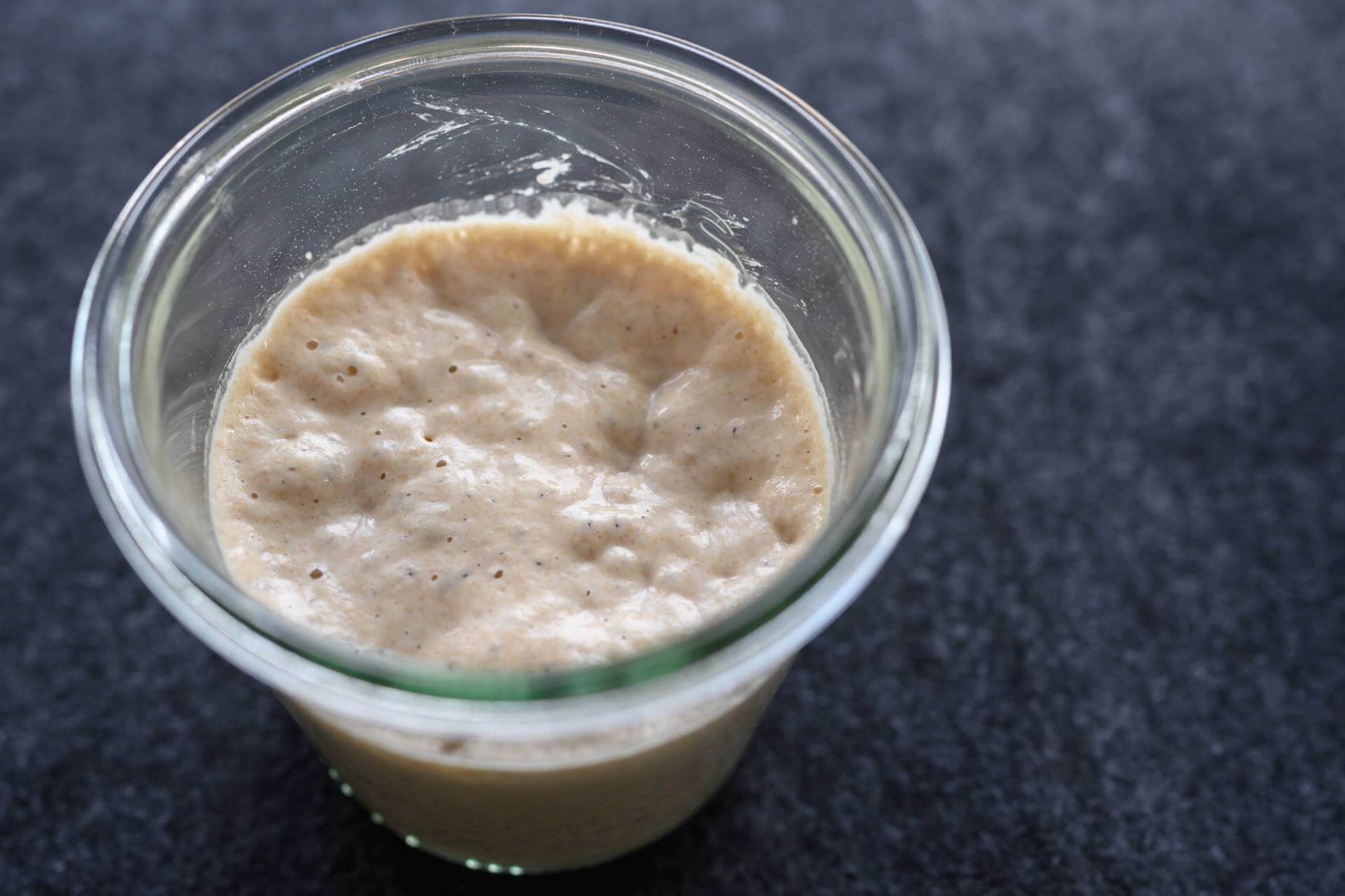 In a small bowl or jar, mix the Levain ingredients. Cover the jar and keep it at a warm temperature for 3 hours.