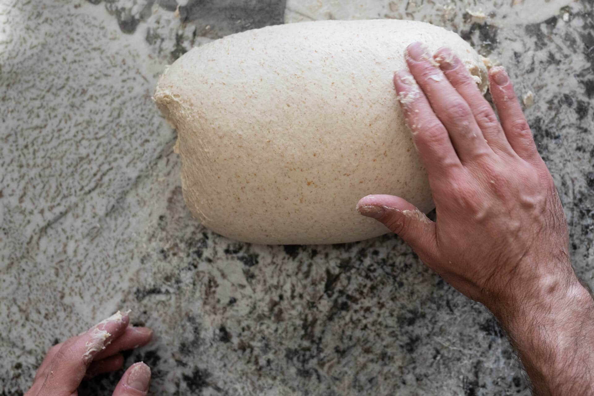 A tip to keep your hands and counter clean: wet your hands often with water, pausing periodically through the kneading process. Keeping them mostly nonstick will help avoid excessive dough tearing. Additionally, use a plastic scraper to occasionally stop and scrape the counter clean, reincorporating any stuck bits back into the mass (you can see me do this in the video below).