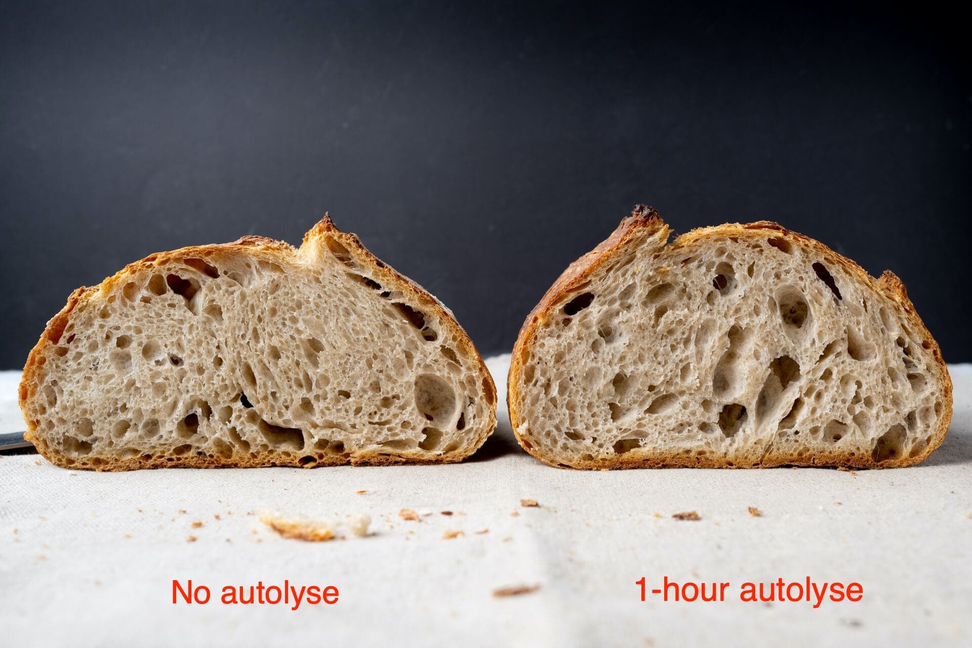 While this comparison is illustrative of the processes at work with an autolyse, it doesn’t outright mean an autolyse will get you better volume, crust color, and a more open interior. An autolyse can help you along the way to achieving these things, but it still requires you to tend to the necessary parts of any bake: strong fermentation, sufficient dough strength, and a full, complete proof.
