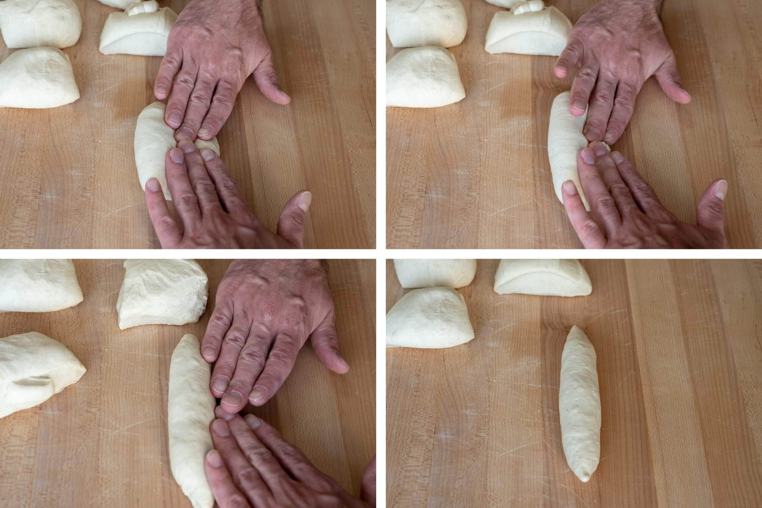 Because the dough is low hydration, keep it covered at all times. Divide the dough into twelve 115 gram rectangular pieces. Preshape each rectangle into a tapered cigar shape. Let the pieces rest 15 minutes covered with plastic.