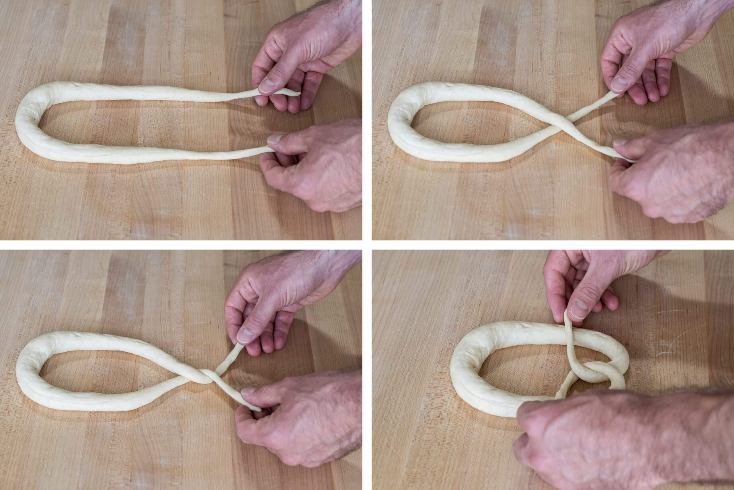 Grab the ends of the dough and arrange the dough so it loops away from you (upper-left image, above). Take one end and fold it over the other side (upper-right image above). Switch your hands so your right hand is holding the new right end and your left is holding the new left end. Fold the same side over the other as previously done (you’ll now have performed two twists). Grab the two ends, fold them up over the knot in the middle, and place each end on its corresponding side inside the loop. It looks nice to have a little overlap with each tip. Then, gently press it down into the side to seal (lower-right image, above).