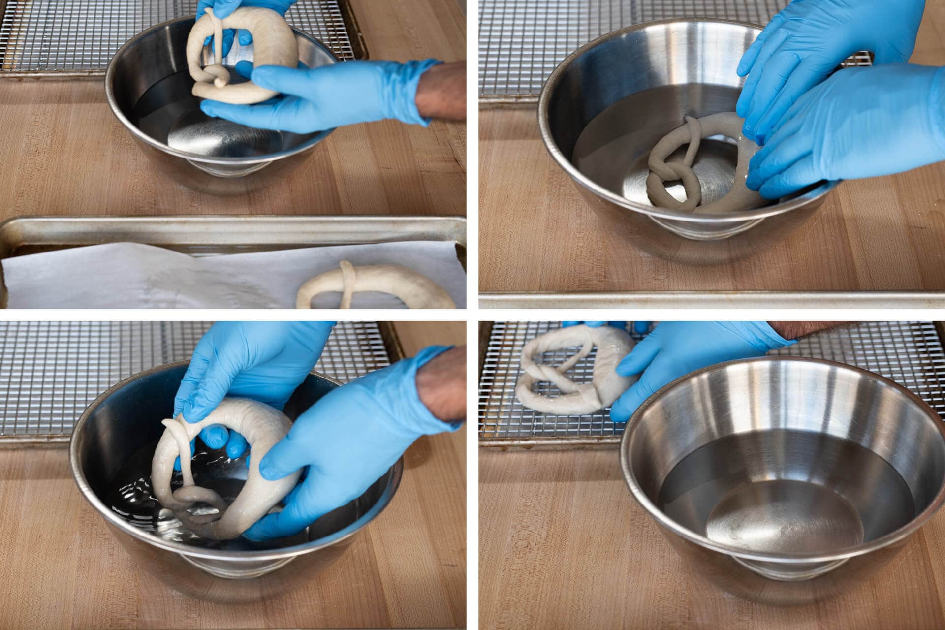 While still wearing gloves, pick up one shaped pretzel and transfer it to the lye bath (upper-left image, above). Let it sit in the bath for 15 to 20 seconds (upper-right image, above) and then transfer it to the wire rack (bottom-left and right image, above). Repeat with 5 more pretzels. Then, transfer the pretzels back to the original sheet pan (it should still have parchment paper or a silicone sheet on top) and setaside. Repeat with the remaining dough.