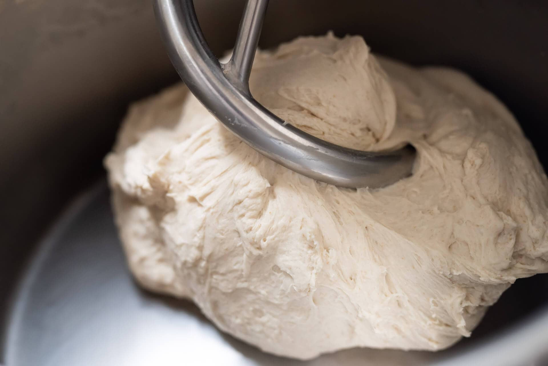 Continue to mix on speed 2 for 4 to 6 minutes until the dough becomes smooth and cohesive. I’ve found the stronger the mix, the better the result.