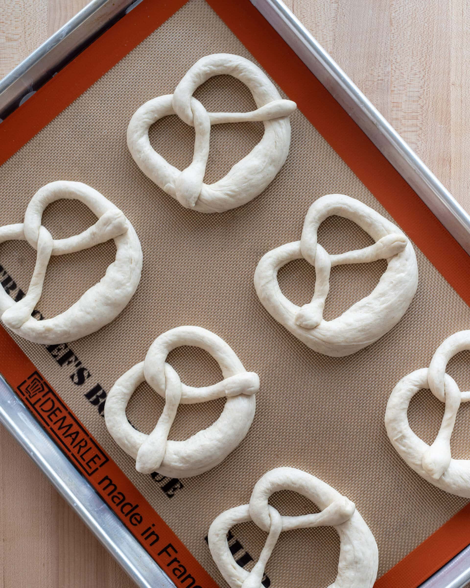 Prepare two large sheet pans by lining them with parchment paper or a silicone baking mat. Depending on how large you roll out and shape your pretzels, you should be able to fit six per 13 x 18-inch sheet pan.