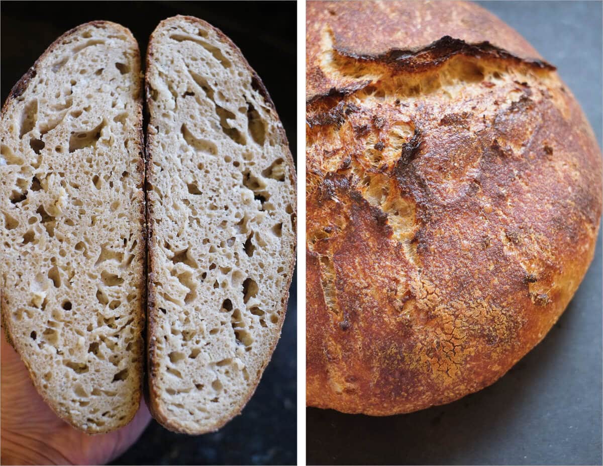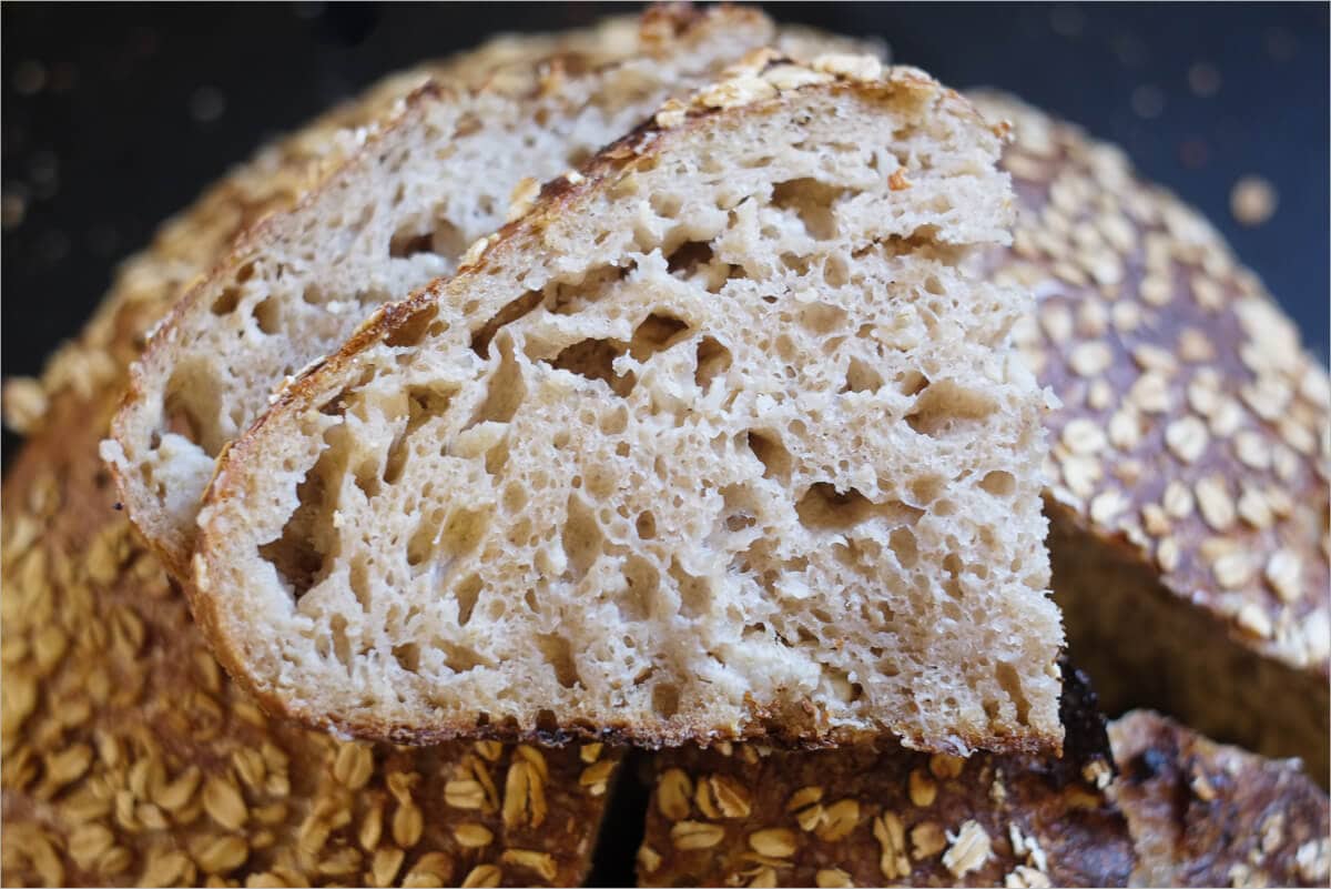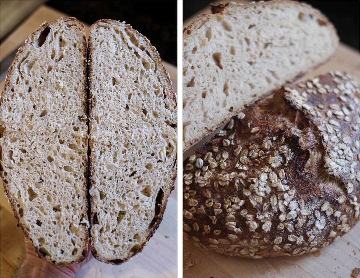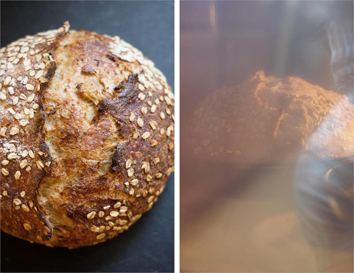 This oat porridge sourdough requires a little longer bake time to get that nice dark outer crust. Additionally, the interior, extremely hydrated by the porridge, takes several additional minutes to bake thoroughly. For this dough you’ll want to experiment with bake times and temperatures, potentially decreasing the heat towards the end of the bake to extend the bake time without scorching the crust. I ended up baking for a total of 35 minutes for the last uncovered portion.