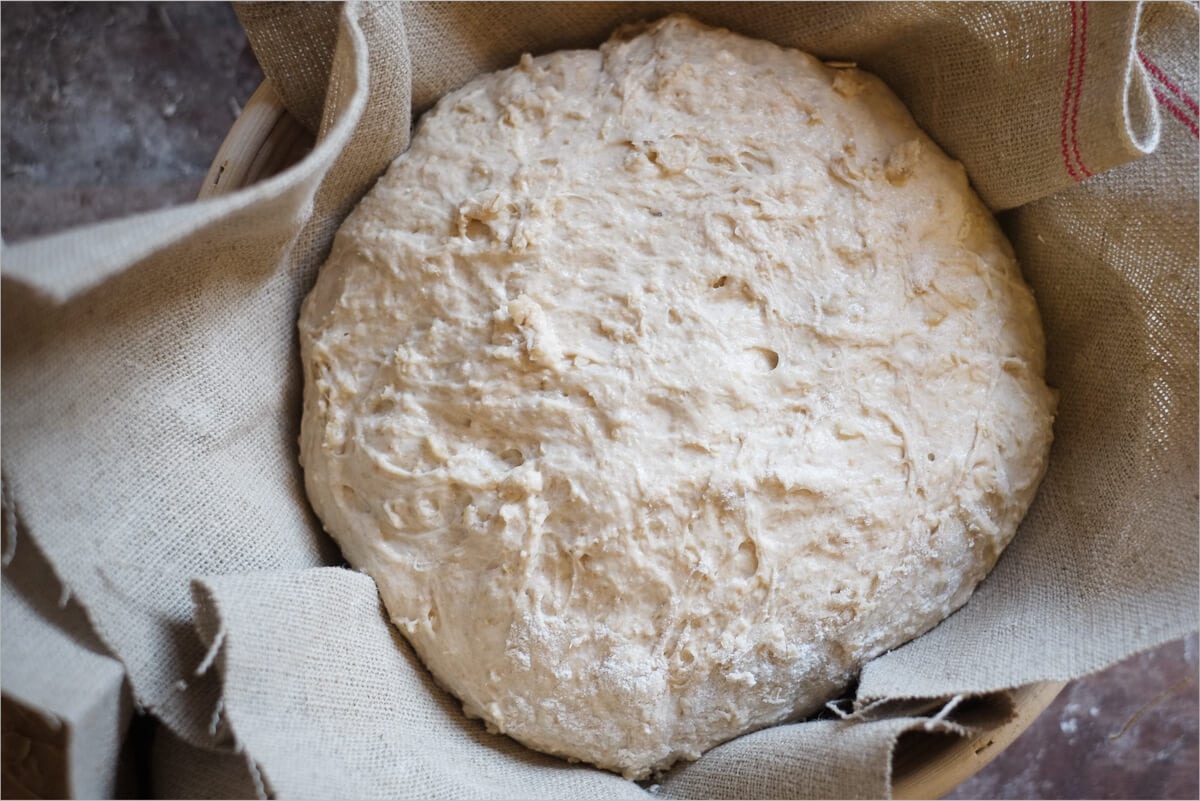 The dough was so wet I felt like I could have just kept strengthening it until the sun set. You’ll need to judge when the dough has reached sufficient strength to stop the stretch and folds. Six sets did the trick for me.