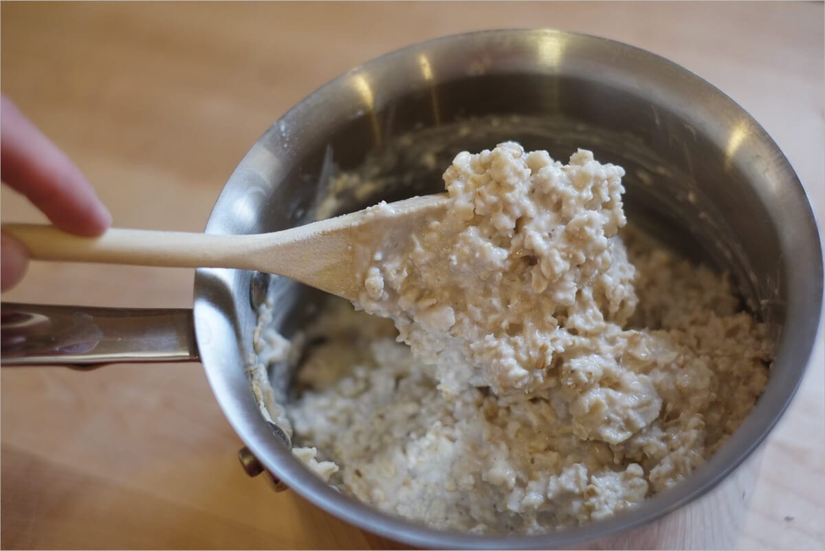 When your levain build is ready for use after its ~ 5-hour rest, first cook your oat porridge.