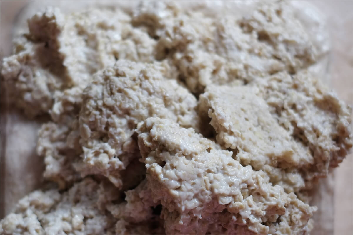 Additionally, the simple act of cooking oats pushes them into releasing much of their starches which in turn makes them very, very sticky (ever noticed if you leave your morning oatmeal in the bowl the oats stick to the bowl like glue?). Not only these two things but since they are sticky and hold together tightly after they are cooked, they can be quite difficult to properly mix through your fermenting dough without destroying the gluten network built up during bulk fermentation. Don’t worry though; we’ll work through each of these issues in turn.