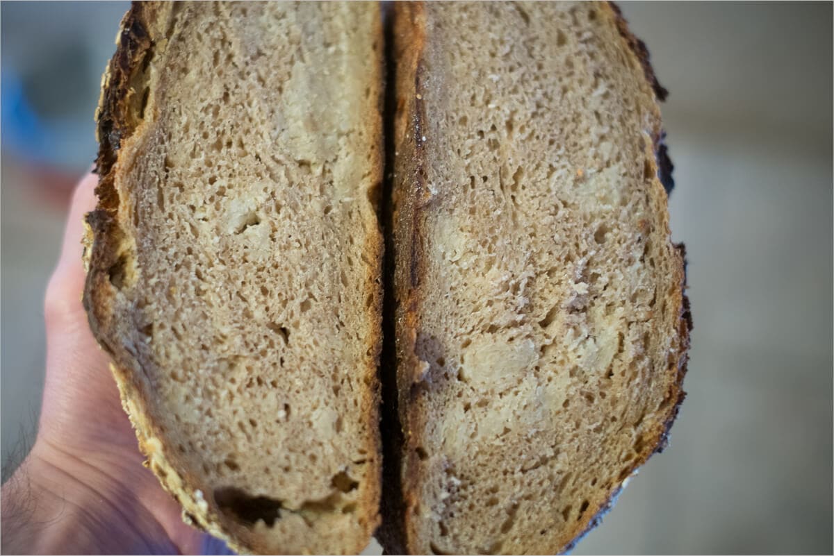 You can see in this shot the crumb was quite light and airy, I love this aspect of this bread. With my mixing and stretch and folding, I finally was able to sufficiently incorporate the oat porridge throughout the loaf.
