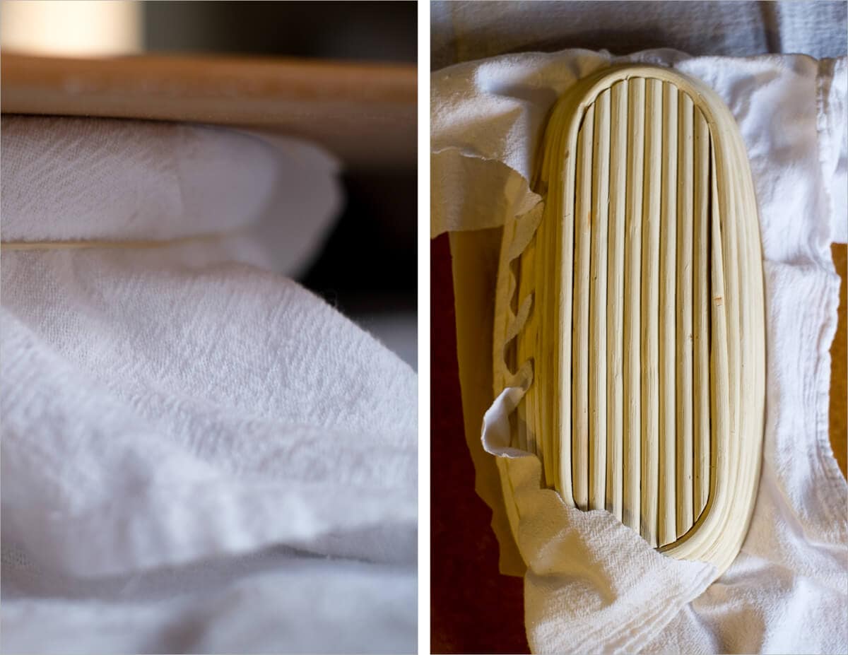 Lightly dust your two linen-lined bannetons with white rice flour. These bowls will hold our fermenting dough overnight in the fridge to proof (final rise).