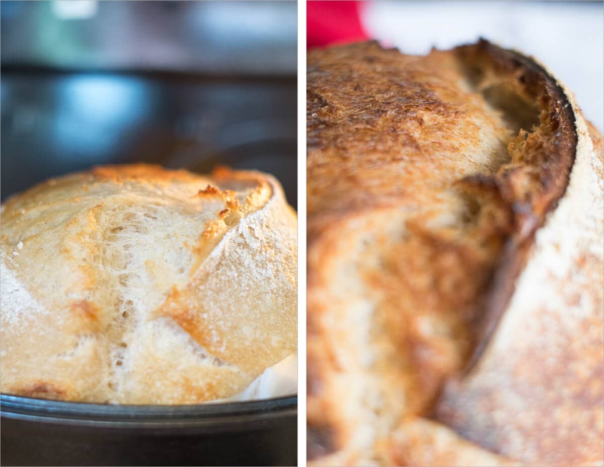 I had a request in my last post to show what this looks like, and here it is. I’ve found this to be the easiest, safest, and best way to transfer dough to your combo cooker without dropping it in and causing gasses to press out. On the left side you can see my linen-lined banneton on the bottom, a piece of parchment paper above that, and finally, the pizza peel on top. After you quickly invert, you’ll see the right side picture below. Then you lift the banneton off, and your dough is ready to be scored and slid into your pan from the oven.