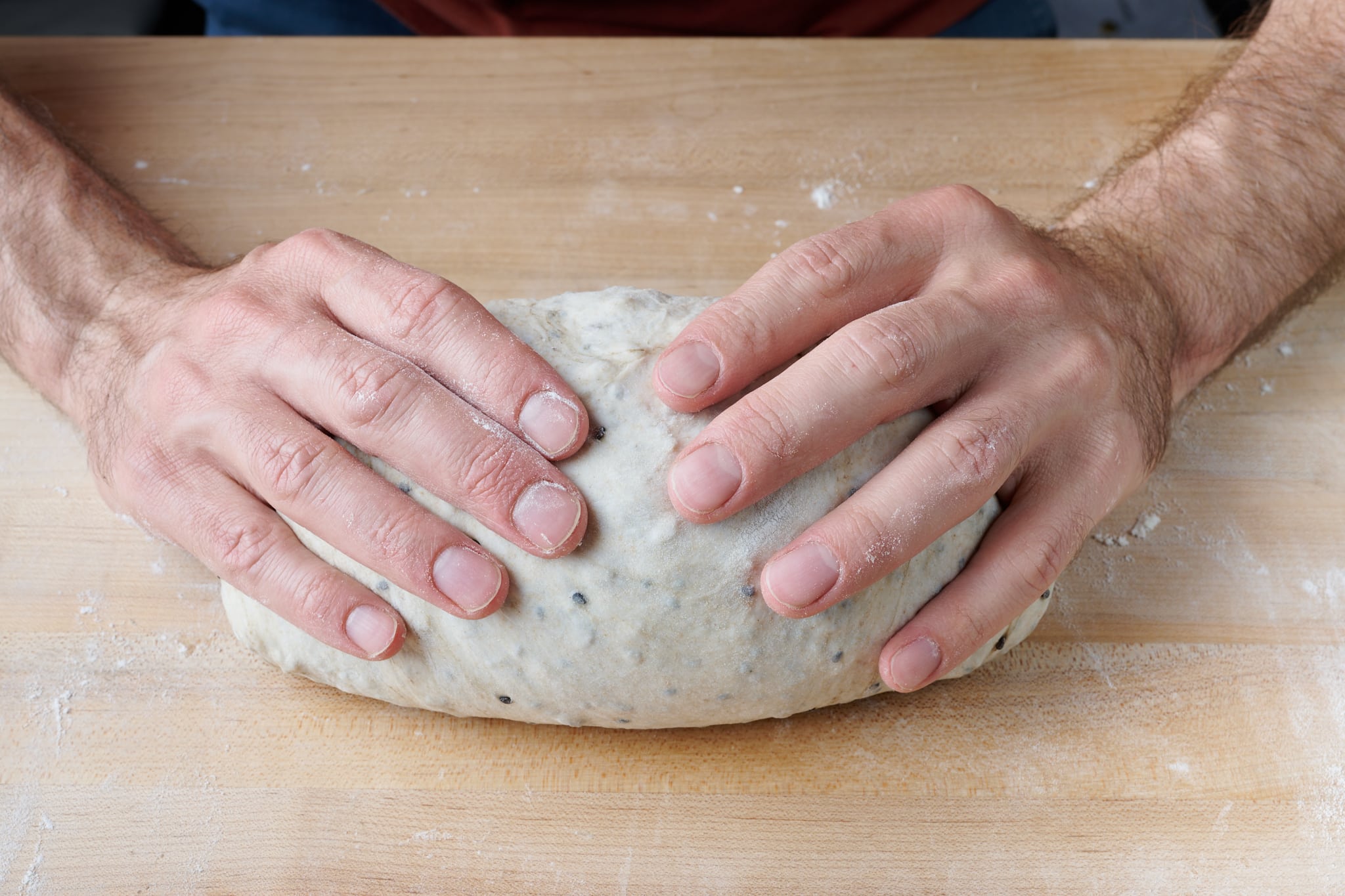This dough will require 3 sets of stretches and folds during bulk fermentation. After the first 30 minutes, spread about one-quarter of the inclusions over the top of the dough. Grab the side of the dough farthest from you, and stretch it over to the other side. Next, spread another one-quarter of the inclusions to the new top. Rotate the bowl 180 degrees and perform another stretch and fold. Next, spread on another one-quarter of the inclusions, rotate the bowl 90 degrees, and do another stretch and fold. Finally, spread on the last inclusions, turn the bowl 180 degrees, and do one last stretch and fold. The dough should be neatly folded up in the bowl.