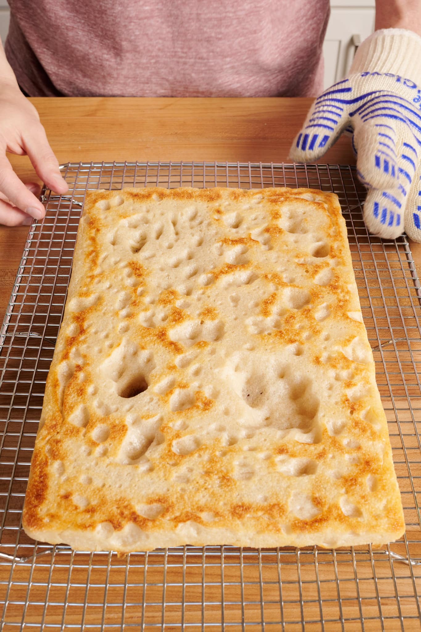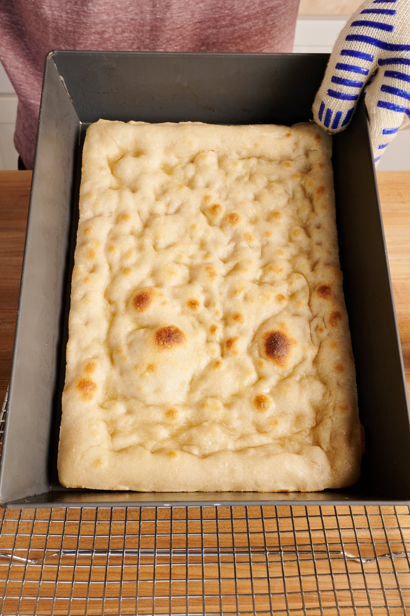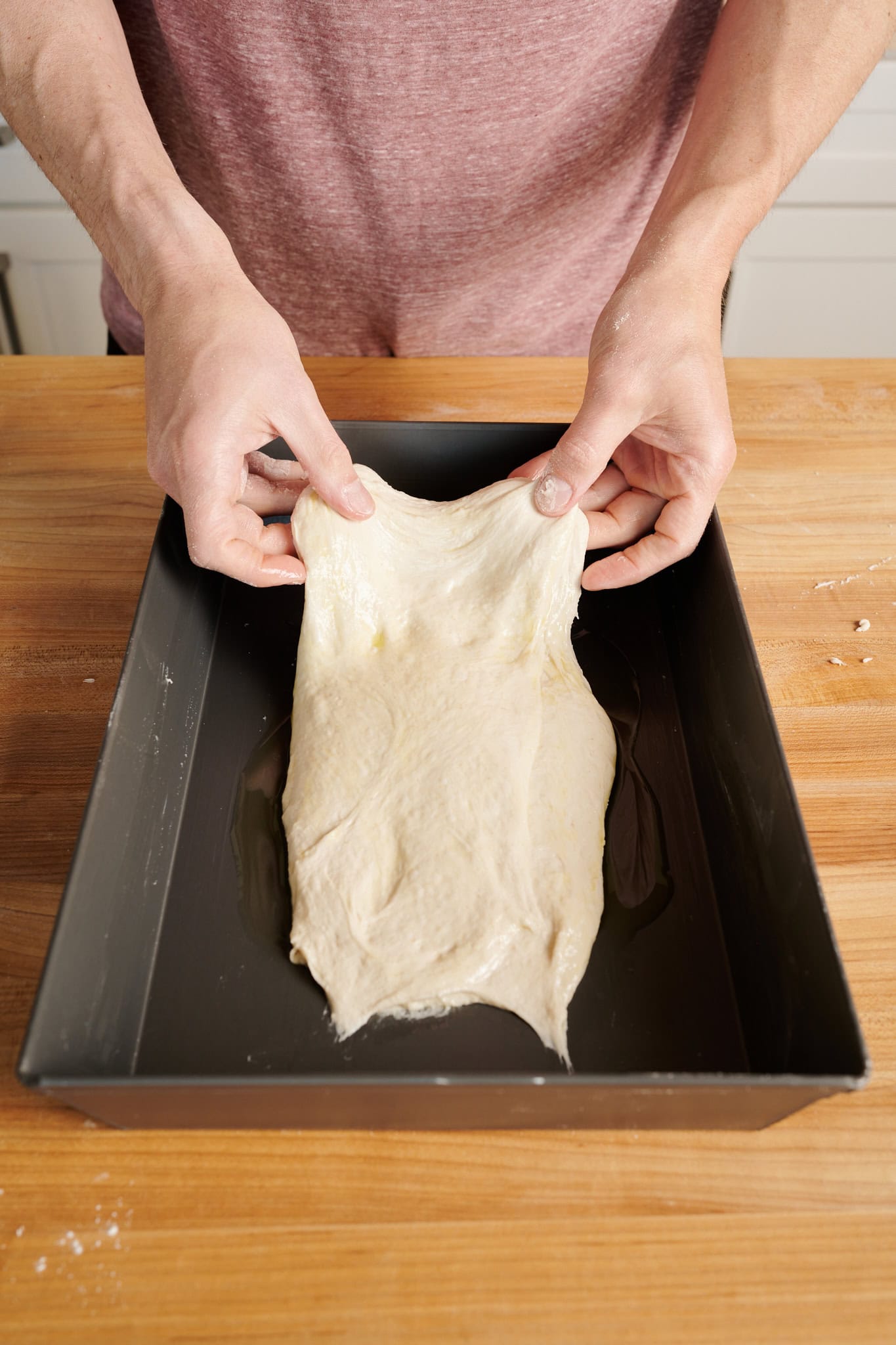 Pour a glug of olive oil into the center of the pan, take one container of dough out of the fridge, uncover, and gently scrape it out on top of the oil. Using wet or oiled fingers, flip the dough over to coat the other side in olive oil, and gently stretch it out to better fit the dimensions of the pan. It’s okay if the dough doesn’t completely stretch out.