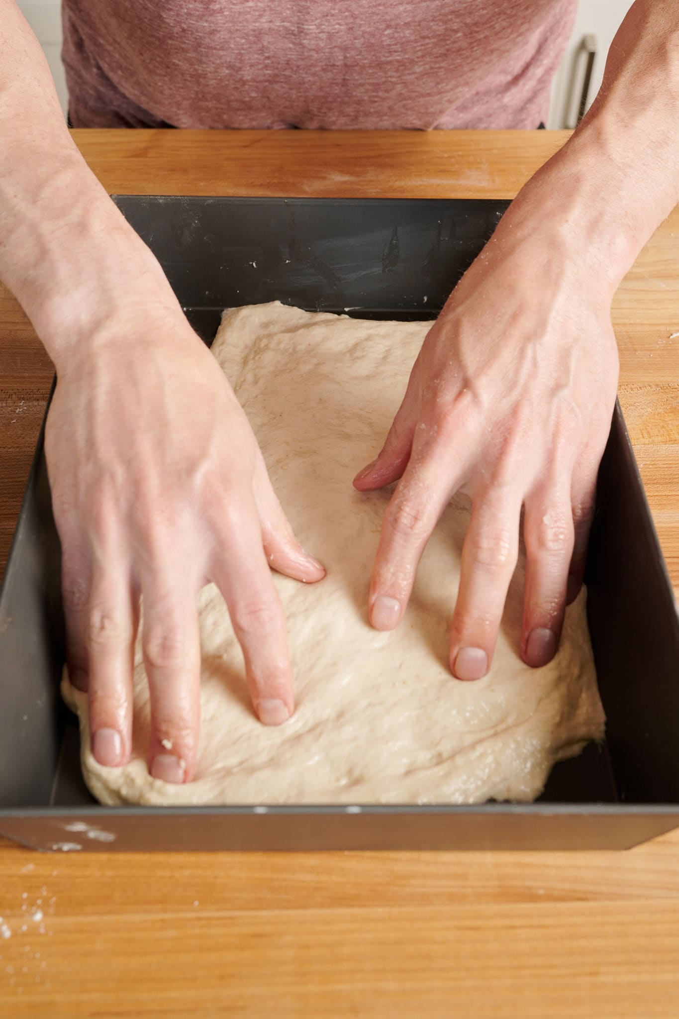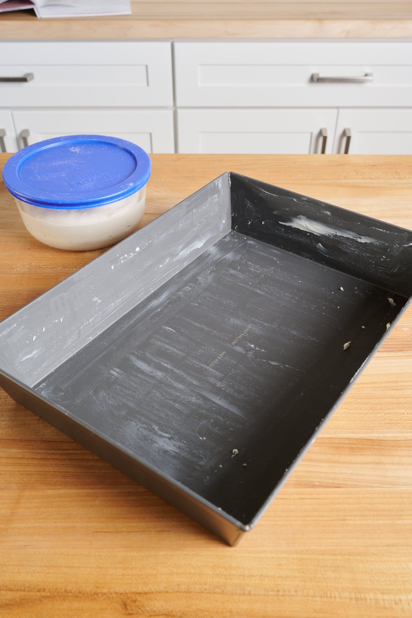 The next day, liberally butter a 10 x 14-inch Detroit-style pizza pan with about 1 tablespoon of butter. According to Alexandra, the butter helps the dough color better on the sides and bottom, but also helps it remove cleanly from the sides of the pan when baking.