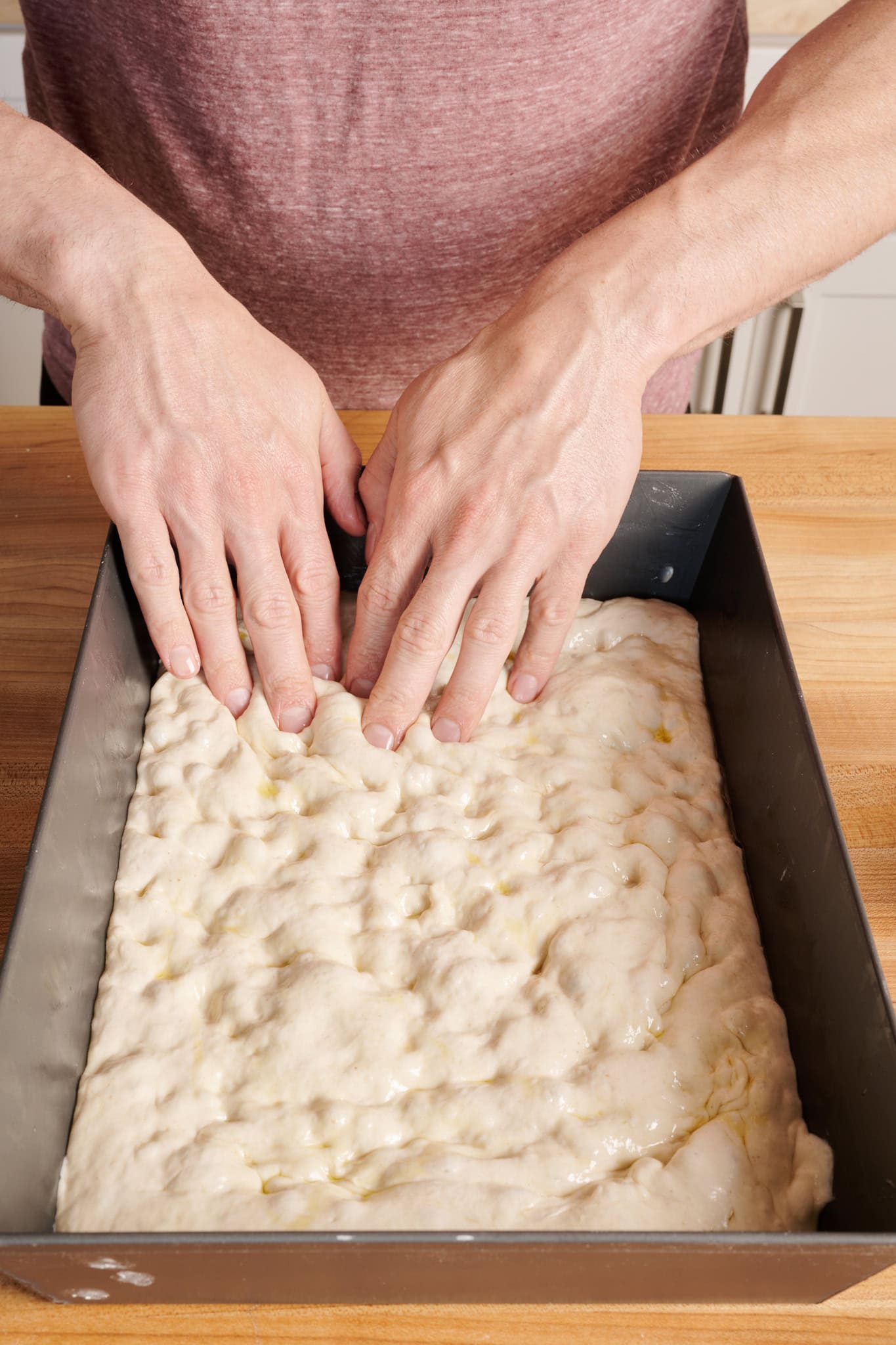 Using oiled fingers, dimple the dough aggressively but try to steer clear of perimeter (leave about a 1/2-inch border).