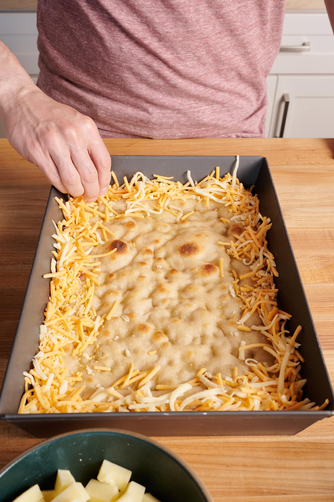 In a medium bowl, combine the shredded cheddar and mozzarella and cube the butterkäse or Wisconsin brick cheese. Place the crust back into the pan bottom-side down.