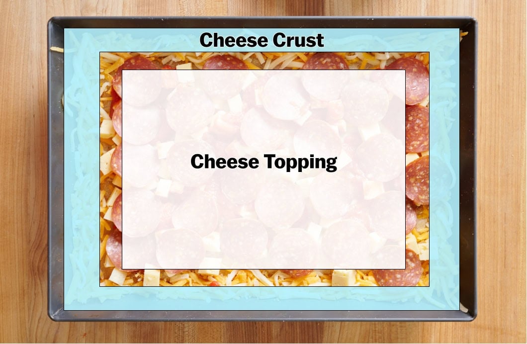 - Cheese crust (the cheese along the perimeter): a mixture of low-moisture whole milk pre-shredded mozzarella, and pre-shredded cheddar (I used mild yellow cheddar)