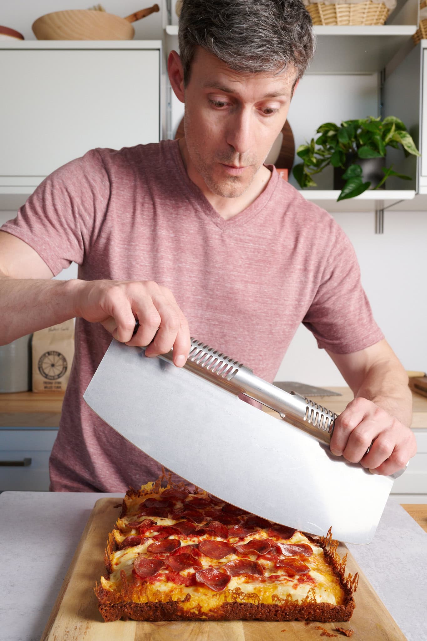 Since Detroit-style pizza is much thicker, it needs a deeper pan. Hands down, the best pan for making this type of pizza I’ve tested with is the 10 x 14-inch LloydPans Detroit Style Pizza Pan. This Detroit-style pizza pan is made of hard-anodized aluminum, is practically nonstick, does not require seasoning, and conducts heat incredibly efficiently for a crispy crust every time.