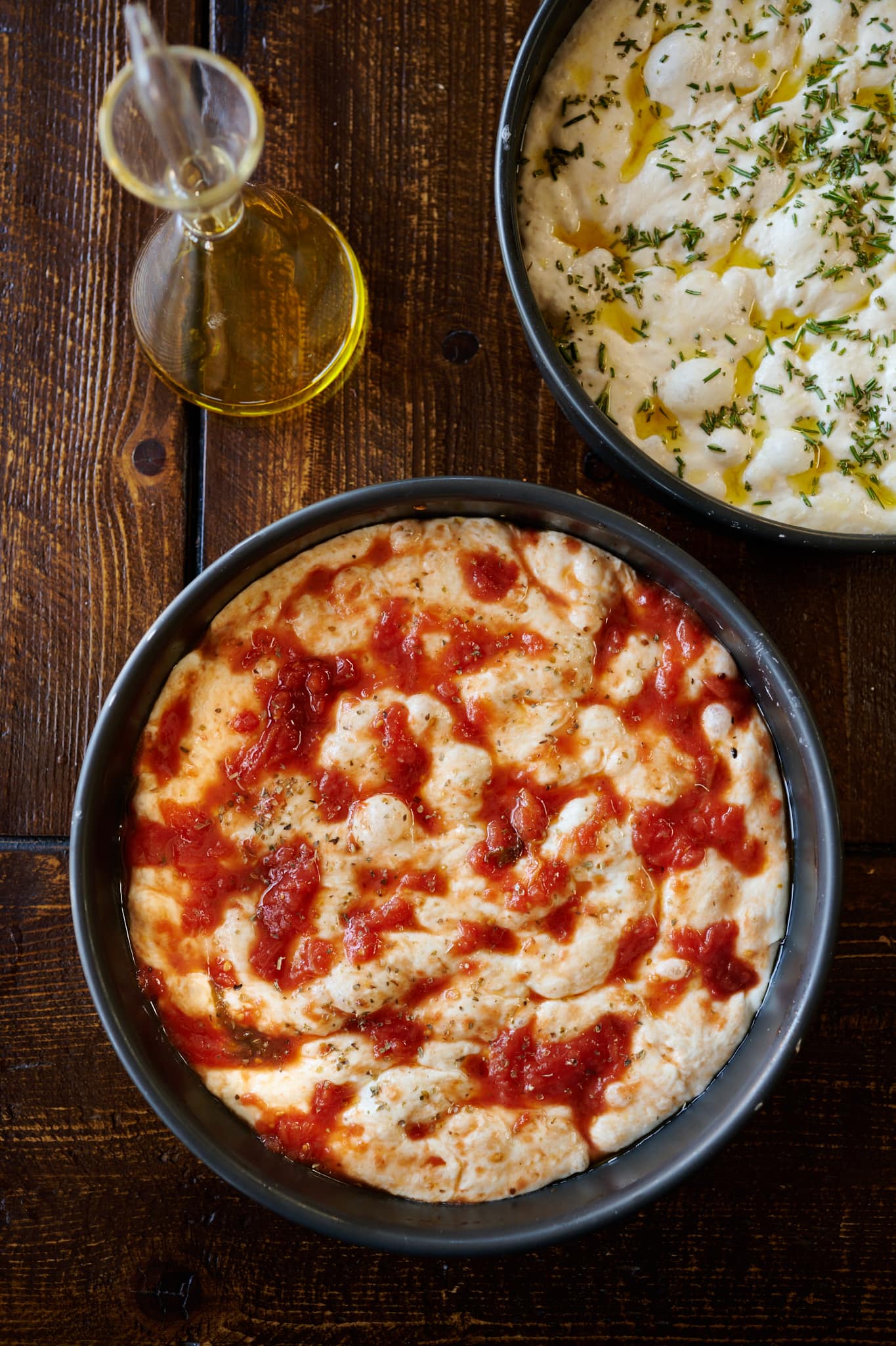 For this focaccia Pugliese, I love using two 10-inch non-stick round pans made by LloydPans. They’re technically deep-dish pizza pans, but they work so well for focaccia. If you don’t have circular pans, you could place all the dough in a single 9 x 13-inch baking pan to make rectangular focaccia.