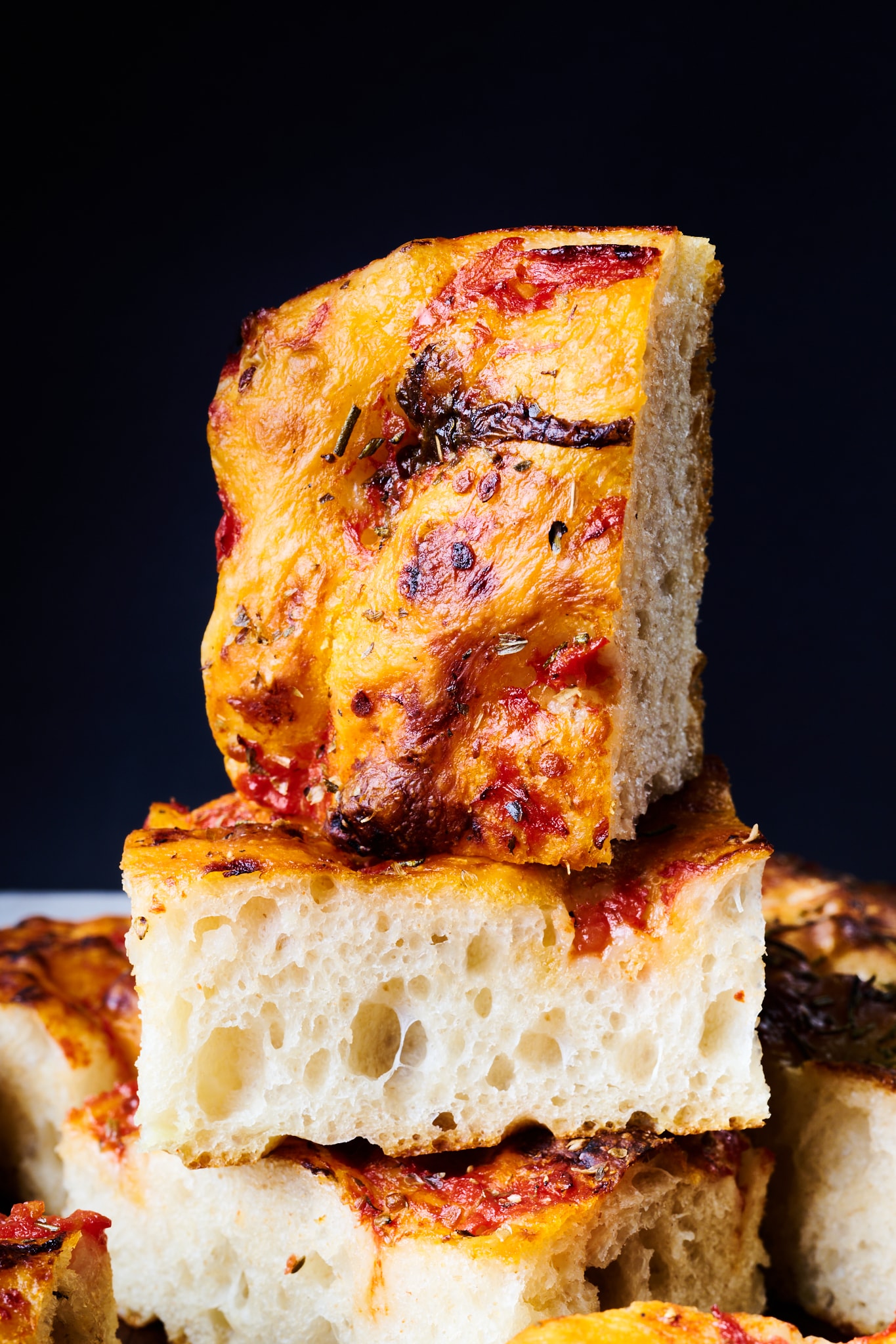 I used my Fontana Forni (sponsors of this recipe) Marinara wood-fired oven to bake this focaccia, and as you can imagine, baking near a live fire imparted a delicious kiss of smokiness to the bread. Further, the wood-fired heat contributed to an even thinner and crispier crust, which nicely plays off the durum flour and olive oil that already push the dough in that direction. If you have a wood-fired oven at home, give this recipe a try in there, and if not, it will work fabulously in a home oven too.
