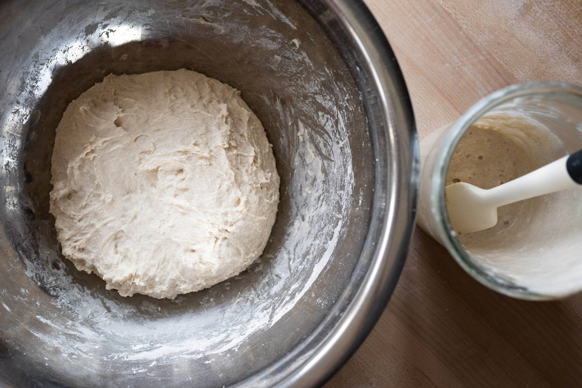 This dough doesn’t require intensive kneading (like slap and fold) but do give it a series of folds (pickup one side and fold it over, rotate the bowl and repeat) in the bowl for 2-5 minutes until it smooths slightly and comes together in a cohesive ball.