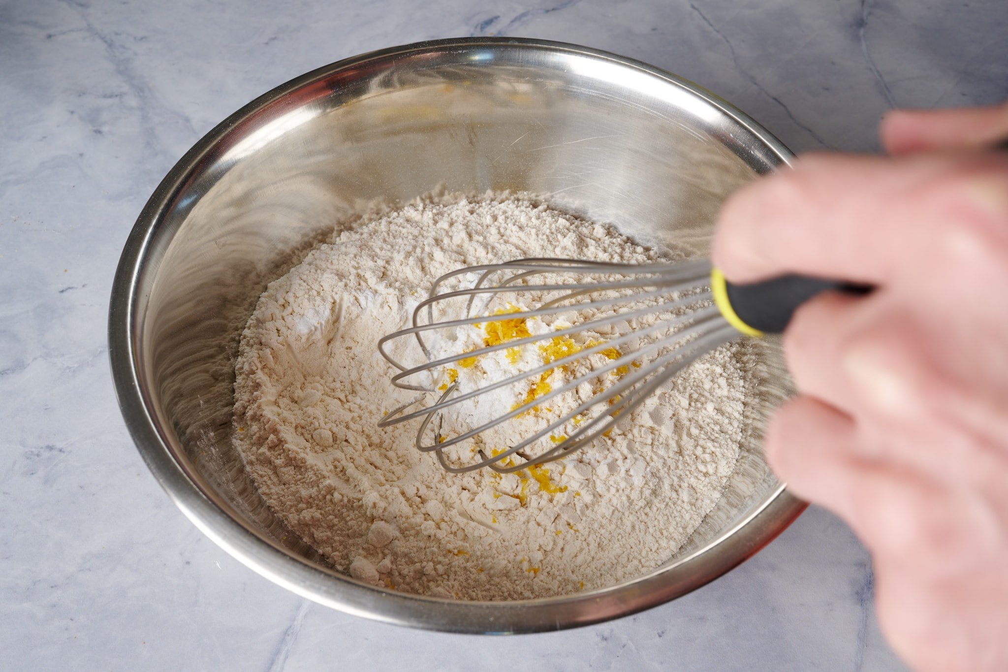 - In a medium bowl, whisk together the flour, baking powder, salt, and lemon zest.