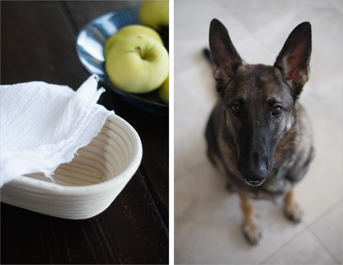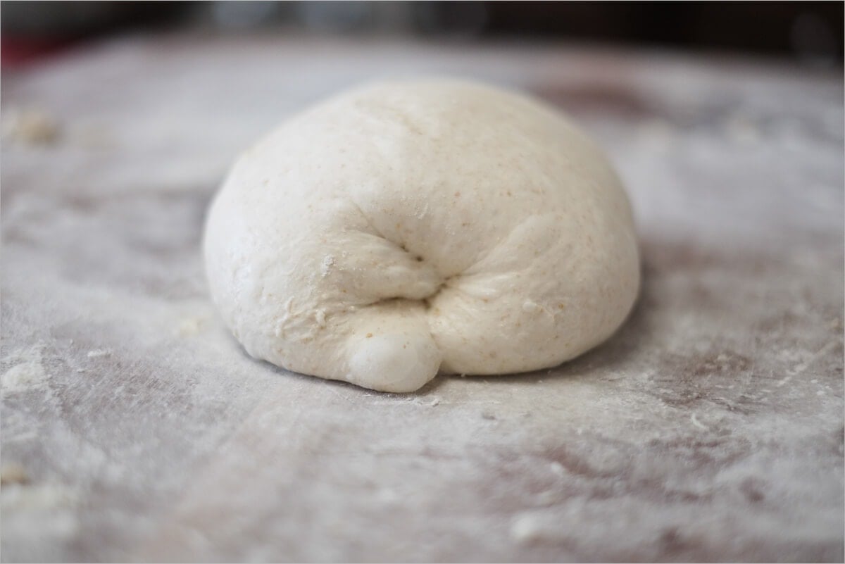 Take the dough out of the container onto your work surface. Divide into two halves and lightly spin the dough in little circles across your work surface with your bench knife in one hand and your other empty hand—kind of like turning a car’s steering wheel. Let this pre-shape rest, covered with a damp towel or inverted bowl, for 20 minutes. My dough had a nice taut skin on the outside with bubbles just wanting to escape but couldn’t quite make it out of the gluten jail I’ve built for them. Sorry guys.