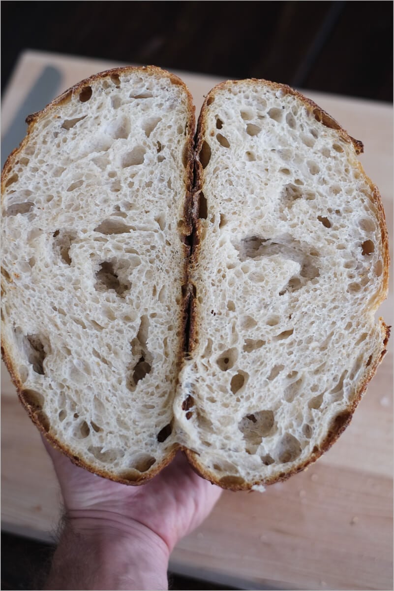 Soft, light and open. Holes all over the place: some large, some small, but very scarce are the areas that were just dense dough. I could do with some more of the large variety, and I’m confident I’ll get more of those as I practice with this method. The reduced levain and longer duration without any interaction helped open things up and create a more airy crumb than I’ve previously been able to achieve. All while keeping the sourness to an absolute minimum.