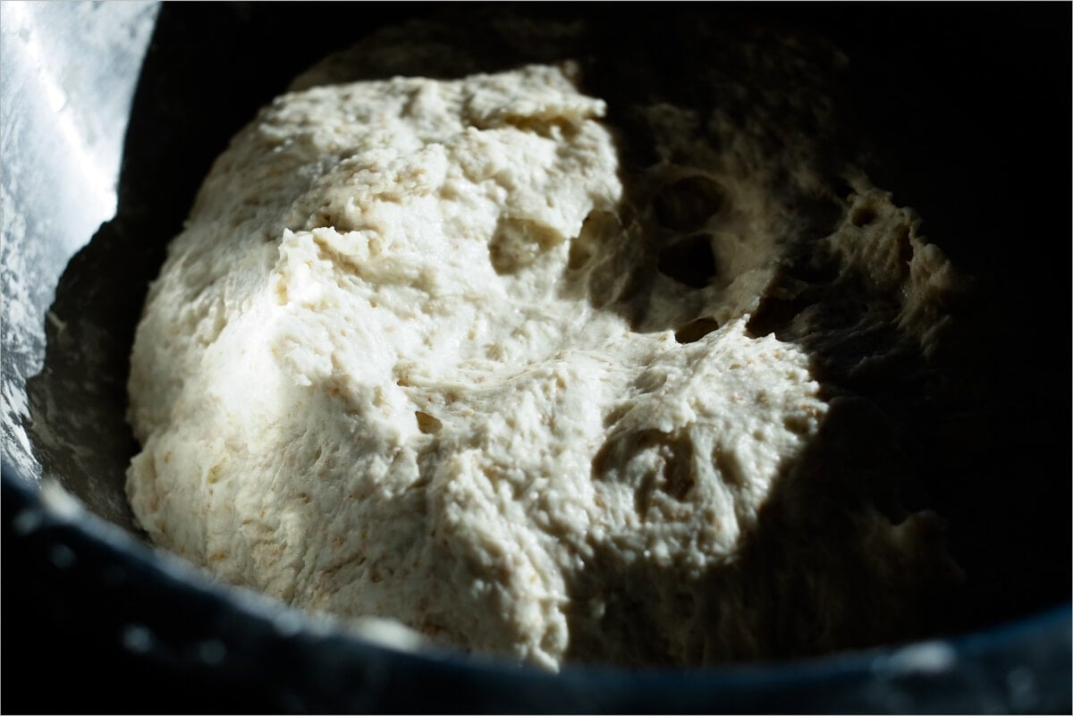 As mentioned in my whole wheat post increasing your autolyse time will change the way your dough feels when you start to mix as you’ll notice it has elasticity and strength early on even before intensive mixing/kneading. It starts the gluten formation process early and begins to smooth the dough, but it also helps bread with a higher percentage of whole grain to fully hydrate before fermentation begins.