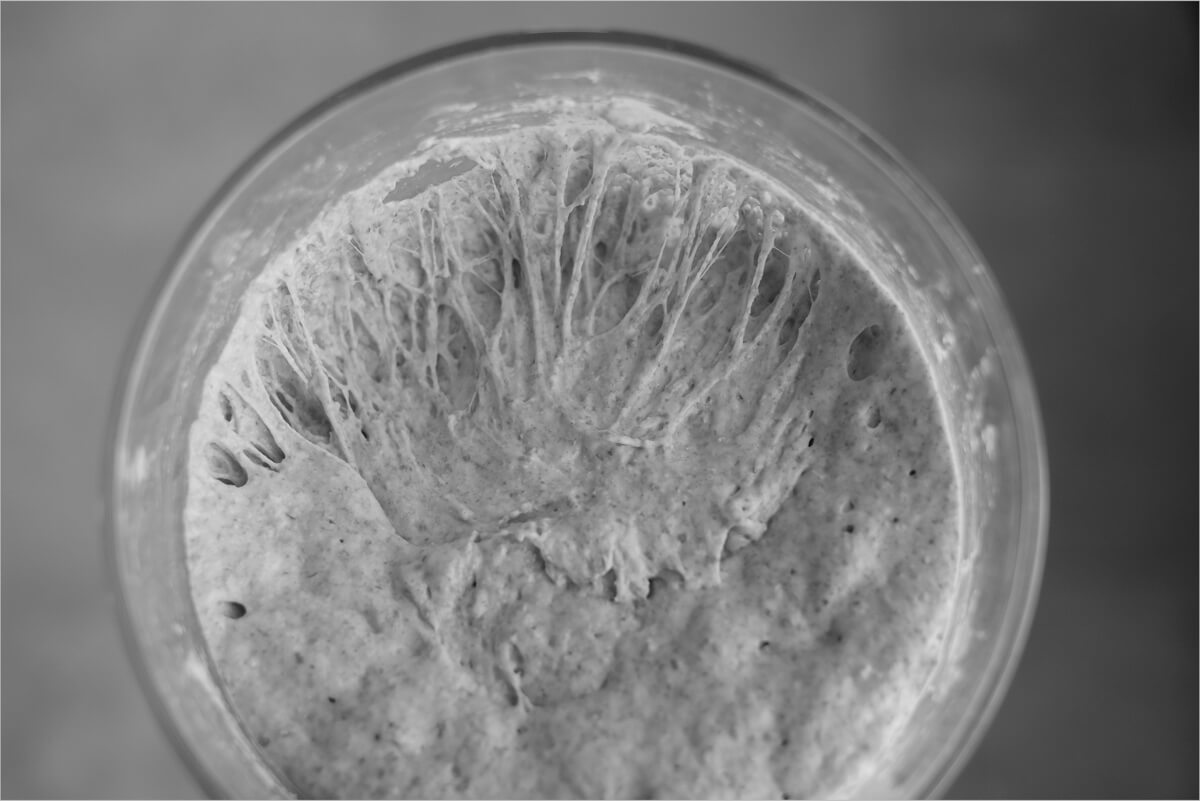 I mentioned, in the beginning, we were going to develop the dough a little bit farther at mix than usual. The goal is to develop the gluten in the dough early instead of later, just enough so it has enough strength to hold onto any gases produced during fermentation. Enough so that we only need two or three more normal sets of stretch and folds during bulk (instead of the typical 6). What does this mean for us and the dough? Well, this means we would leave our dough untouched in the bulk container for much longer near the end. My thoughts and the thoughts of many books & bakers out there is that if you’re looking for a more open crumb, you want to handle the dough even less towards the end of bulk.