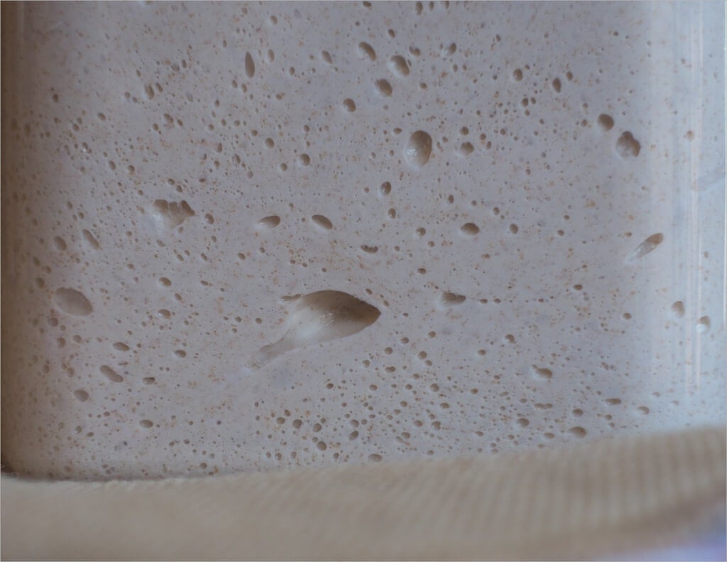 This dough felt nice and strong at around 2:00 p.m., I could see it come off the sides of the container easily and it had risen to the top almost touching my plastic cover. Here you can see the pockets of fermentation activity throughout: