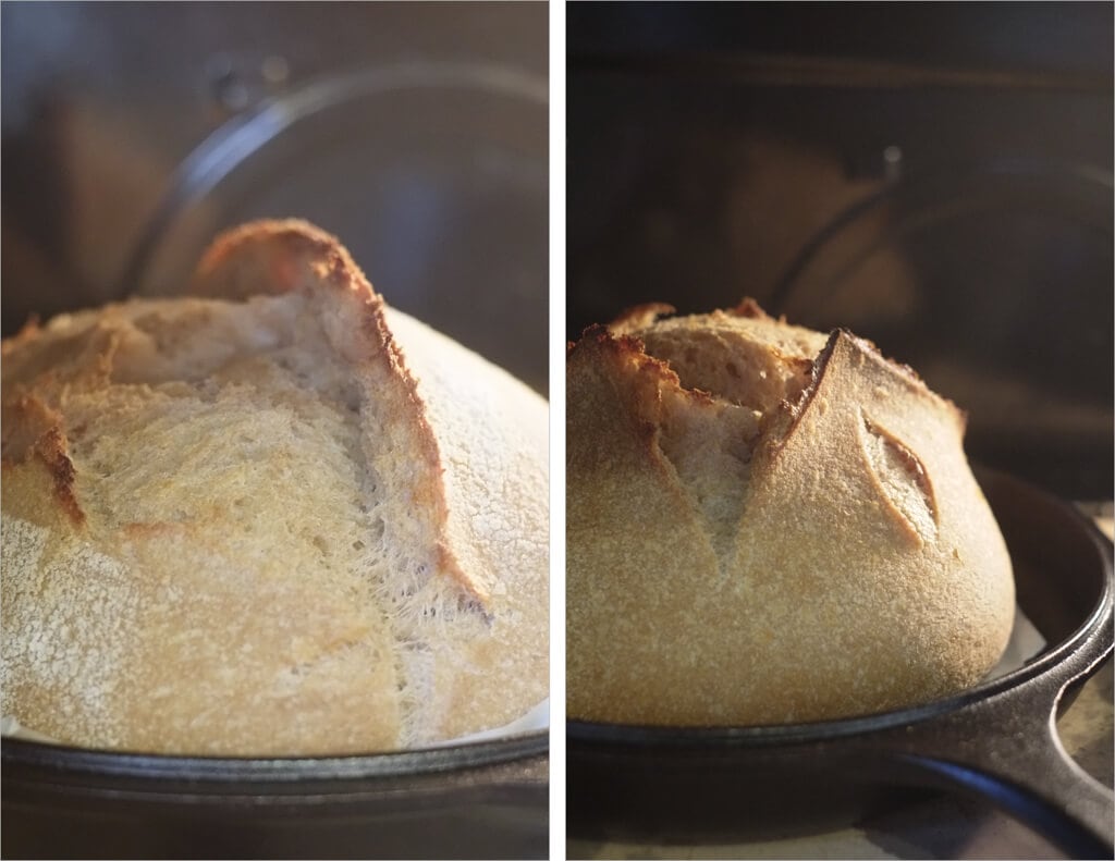 Place the dough into the combo cooker and bake, covered, for 20 minutes. After 20 minutes, take the lid off the combo cooker and bake at 450°F (230°C) for an additional 30 minutes, until done. For each of these, I had to go a bit longer than 30 minutes until the interior temp reached between 205-210°F (96-99°C).