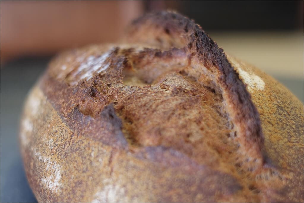 When you score these whole-grain loaves, try not to dig in too deep at a 90° angle. If you go too deep, your loaf may not rise to its full potential. For the boule, I do a very light 90° “X” shape, and the batard is my usual 40° crescent from one side to the other.