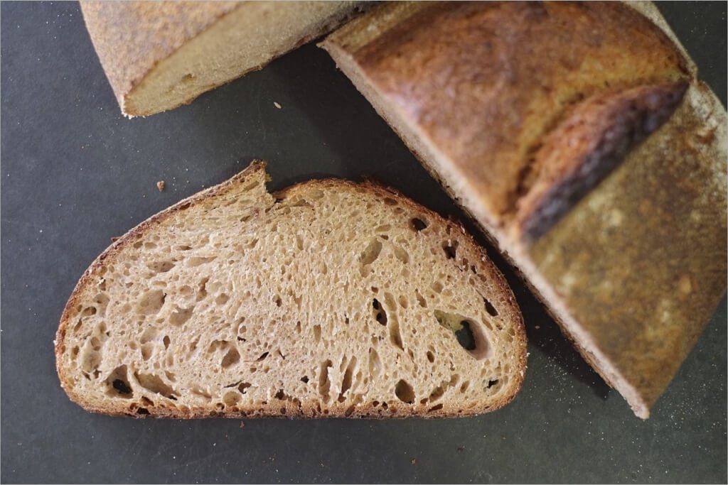 High rise on these two! Each slice is open and airy with an excellent level of tenderness. At 95% hydration, a moist crumb is to be expected but I think this might be pushing the hydration levels, more water would not help this achieve anything further. Plus, pushing hydration more than 95% exits my shaping comfort zone as its very hard to handle (I’ve done a 115% hydration loaf, and I thought I was going to end up pitching the entire batch it was so difficult).