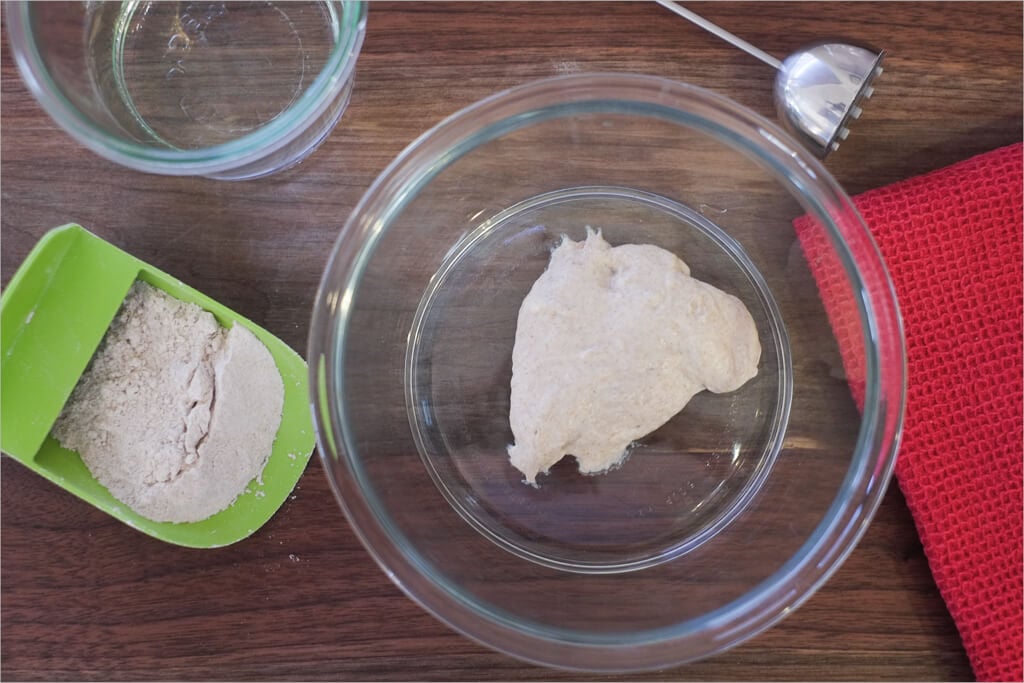 After six hours mix an additional 125g water and 175g levain in a separate bowl. Mix these until you’ve fully dissolved the levain in the water.