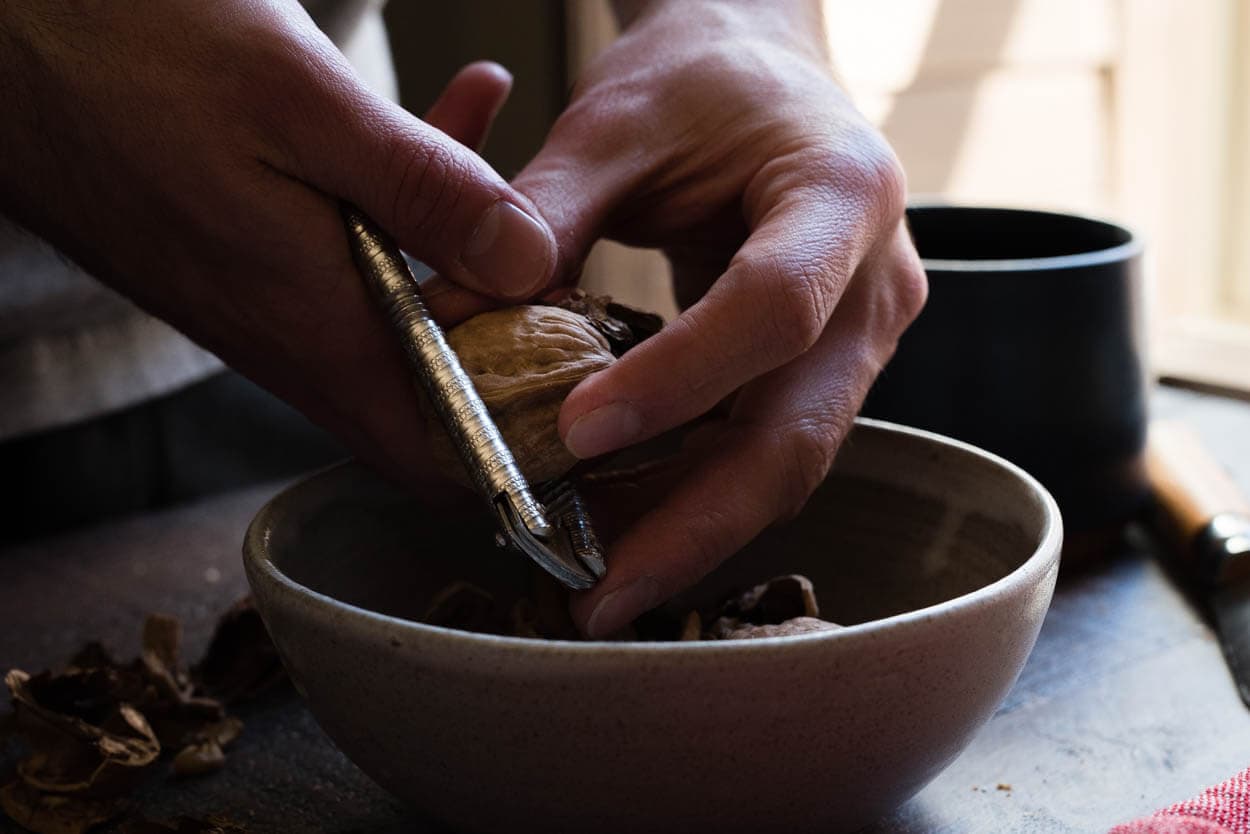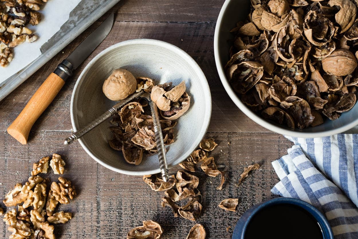 I ordered two bags of unshelled walnuts for this recipe, and thankfully one of those bags made it out of my grubby hands to mix time. I suggest when you prepare these walnuts shell a few extra grams because you will eat a few just before you toss them into your dough. If you’ve not had the chance to use walnut oil before, you’re really in for a treat. You can not only use it for baking but whisked up in a vinaigrette it adds an intense and complex flavor to your salads that’s hard to beat. And to streamline this whole thing eat this walnut sourdough with your walnut-y vinaigrette salad — sure to win over even the pickiest of picky. This is not a cheap bread to make. Good quality, organic walnuts (especially in the shell) can be a costly endeavor, particularly so when out of season. I’ve tried this bread with your run-of-the-mill bagged whole walnuts, and you know what, the bread still tastes fantastic. Still not cheap, but incredible nonetheless. It’s a bread you occasionally splurge on and one you’ll thank yourself for long after that first bite. Let’s get shelling and let’s get baking.
