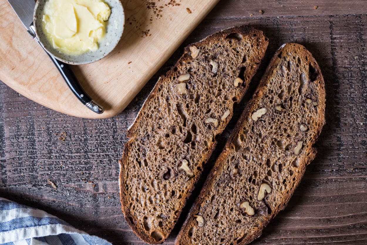 The freshly milled flour, at one-hundred-percent, brings so much flavor it’s good on its own. Add the walnuts, though, and you have a winner. I love this bread, plain and simple. I enjoyed it heavily toasted with cultured butter — that’s all you need. Healthy, hearty and deeply satisfying meal on its own. Adding 20% walnuts is perfect for this bread: just about every bite has some walnut. However, you can increase this to your liking. Additionally, feel free to increase the walnut oil or leave it out entirely.
