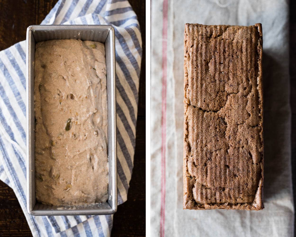 I used my 9” x 4” x 4″ Pullman Pan for this bread. It has a nice lid you slide on to create that flat top, and you’d be hard-pressed to get anything to stick to the sides of this thing. If you have a 9×4 pan that doesn’t have a lid I’m sure that will work just as well, you’ll end up with a domed top which would be just fine.