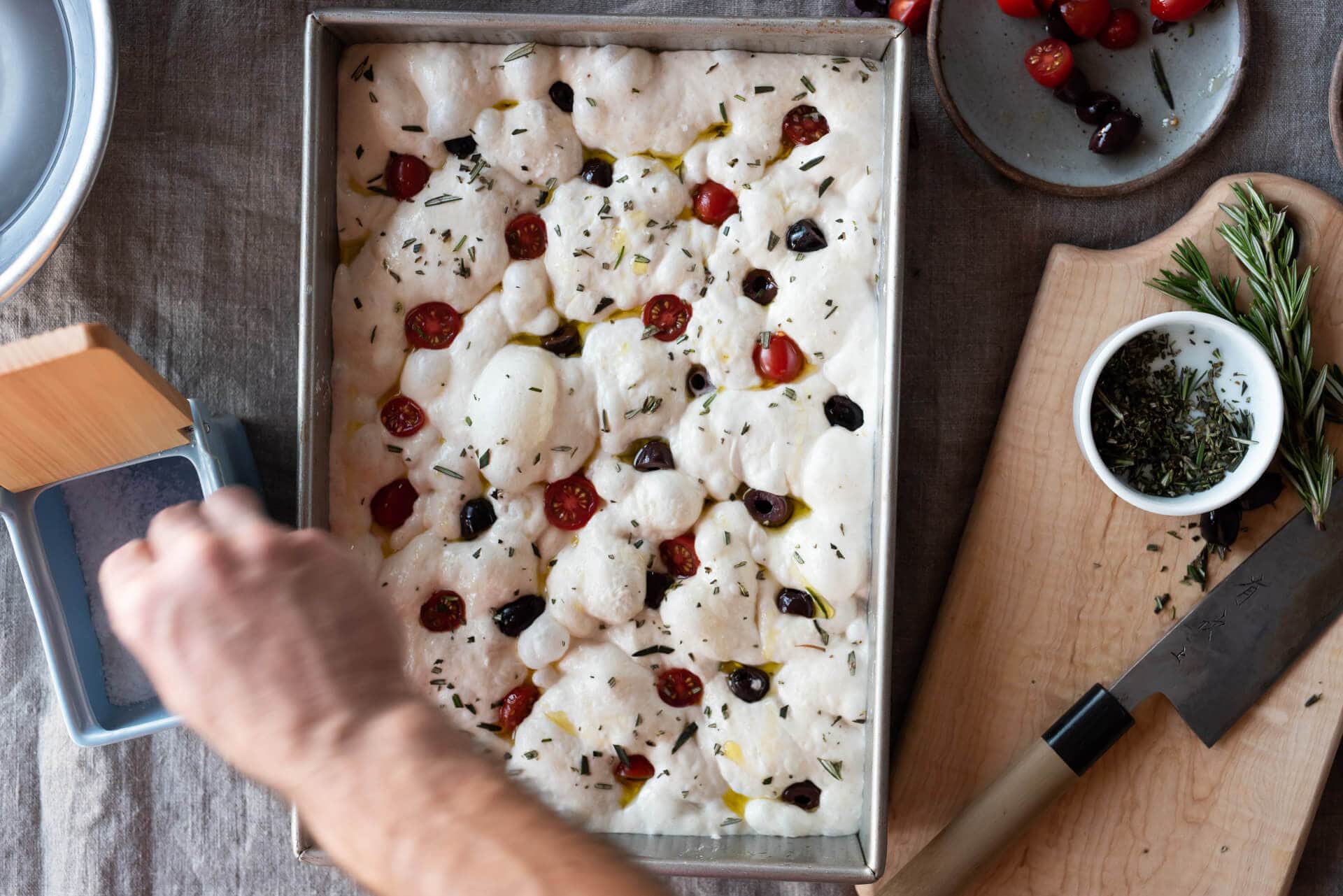 When I topped the pillowy focaccia dough, the aroma of fruity olive oil and chopped rosemary was captivating. Once the pan was slid into the oven, my house gradually filled with the most intoxicating perfume as the dough rose high and the edges began to crisp. The melange of baking dough, toasted herbs, olive oil, and briny olives had me checking the oven frequently—as if checking on it would expedite things. Sit tight, wait for it to finish, I told myself as I gently slapped my hand from opening the door yet again.