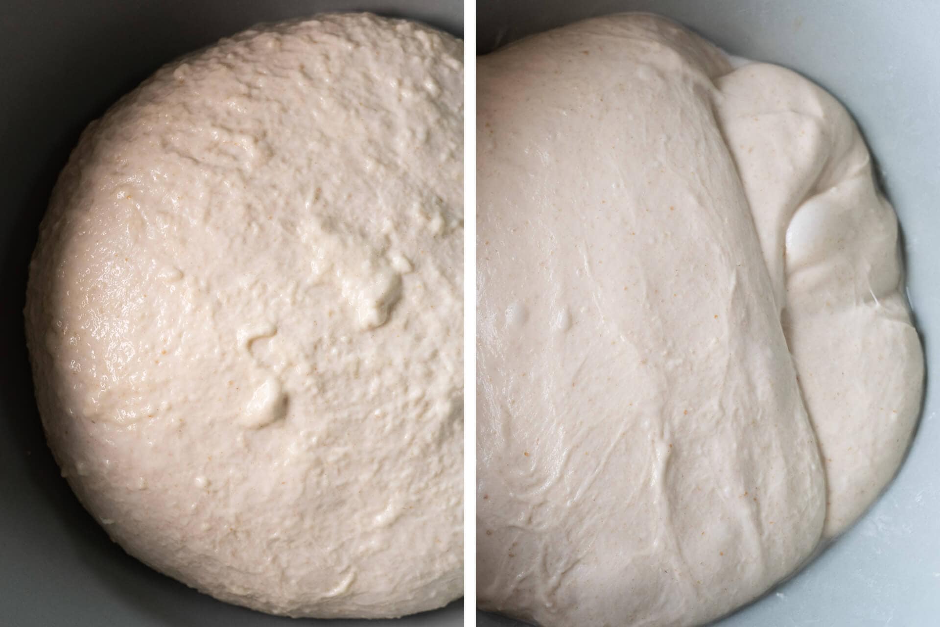 As you can see below on the left, the dough is still very wet and chunky immediately after mixing. However, it’s not falling apart or soupy. Please resist the temptation to add more flour at this point. As you can see below in the image at the right, by the middle of bulk fermentation, it’ll strengthen after several sets of stretch and folds (see my guide on how to stretch and fold sourdough for more information).