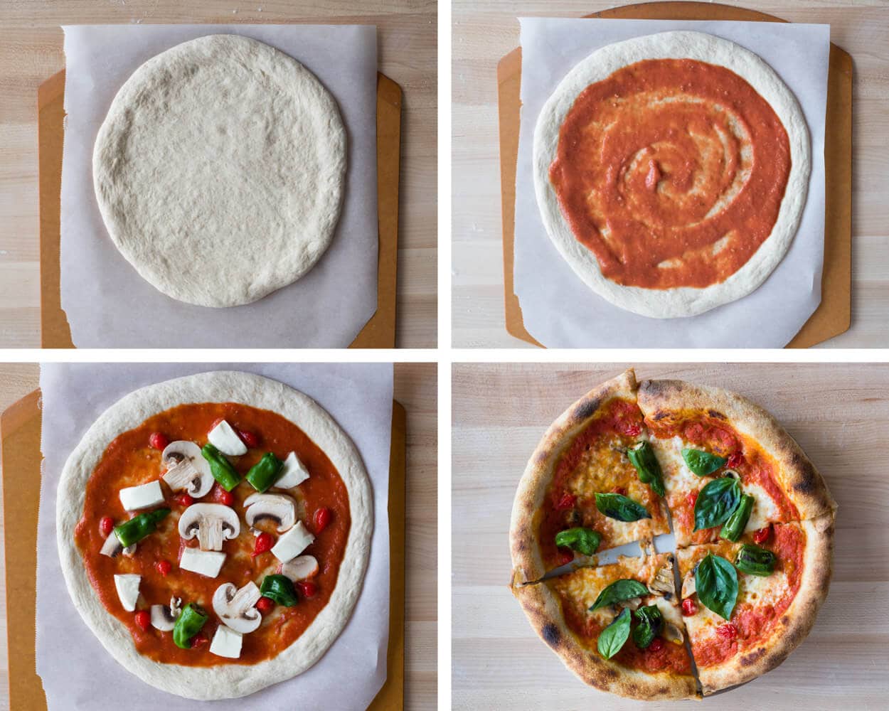 Below are a few suggestions for pizzas I make often. I like to top my pizza lightly, using only small amounts cheese and sauce. You’ll see in the recipes below and my images throughout—it’s just my preference.