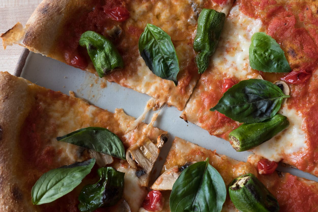 Great pizza has a thin, sturdy, and well-cooked crust with an airy and soft cornicione (rim). It should sort of sag a bit when you hold a slice in the air but not flop over completely like Neapolitan-style pizza. The bottom should be well cooked with dark spots scattered about, but not the typical leopard spotting you might find when cooking pizza in a high-heat oven. The toppings should be a light dusting of items, especially the cheese—everything in balance.