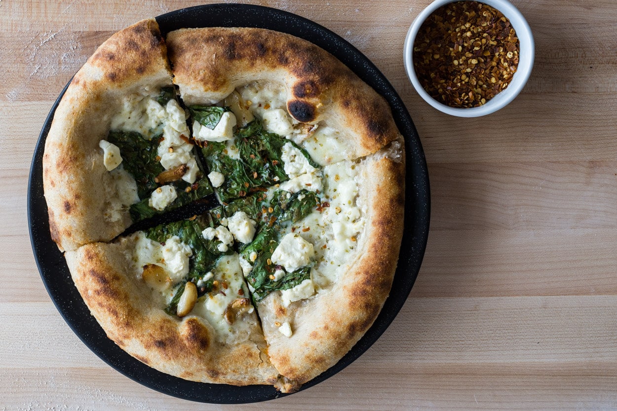 Sourdough pizza topped with spinach, feta, and chile flakes.