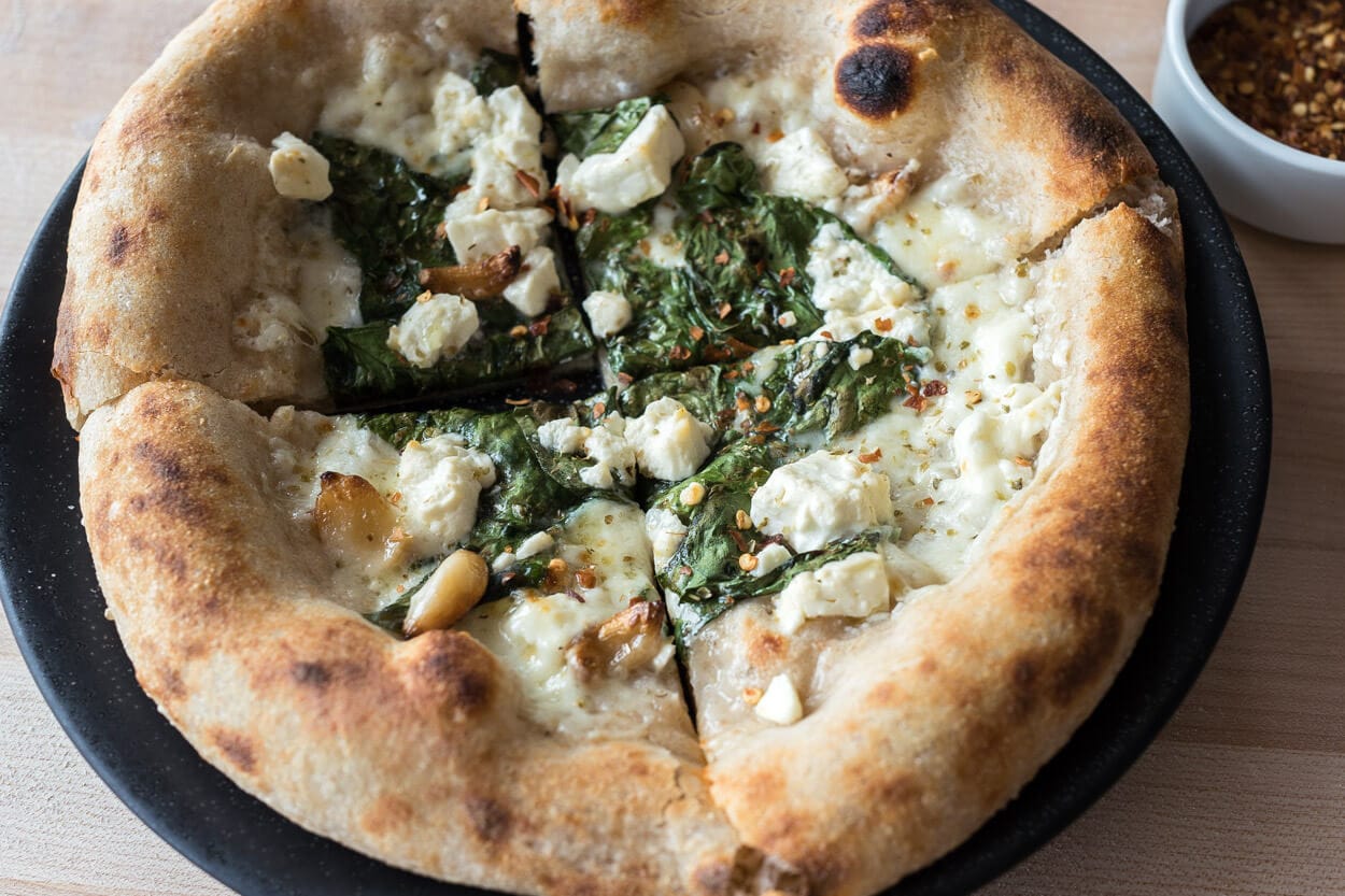 Sourdough pizza with spinach, feta, and garlic confit