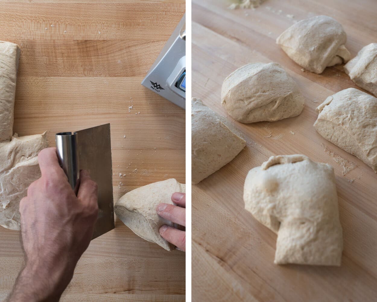 Dividing sourdough pizza dough.