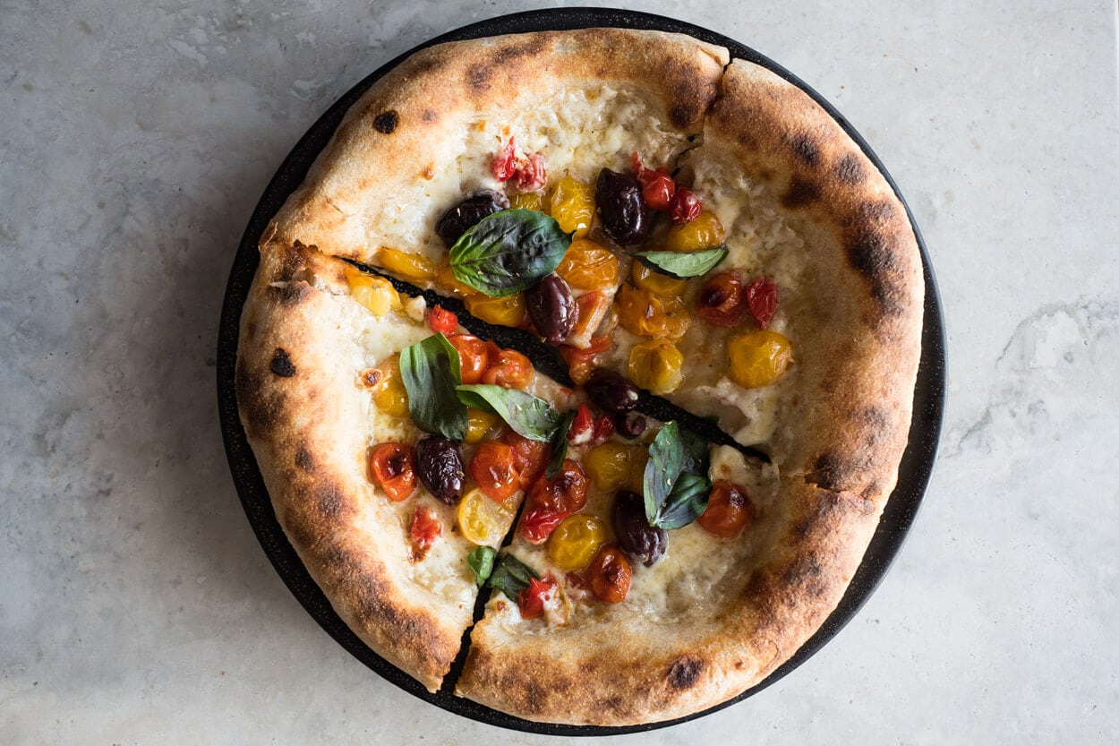 A “white” sourdough pizza with cherry tomatoes, basil, and cheese.