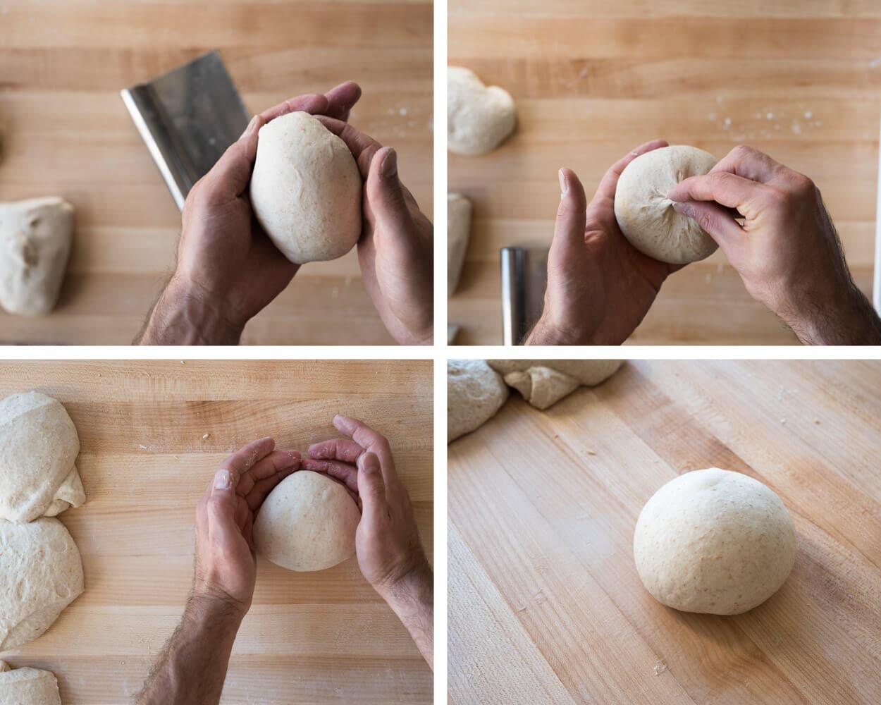 There are a few ways to do this, but my favorite way is to pick up the ball and, using both hands, tuck the dough back and into itself as you rotate it around in your hand (see the upper-left image above). Work your way around and around, stretching and tucking, then flip the ball over and pinch the bottom to close the seam.