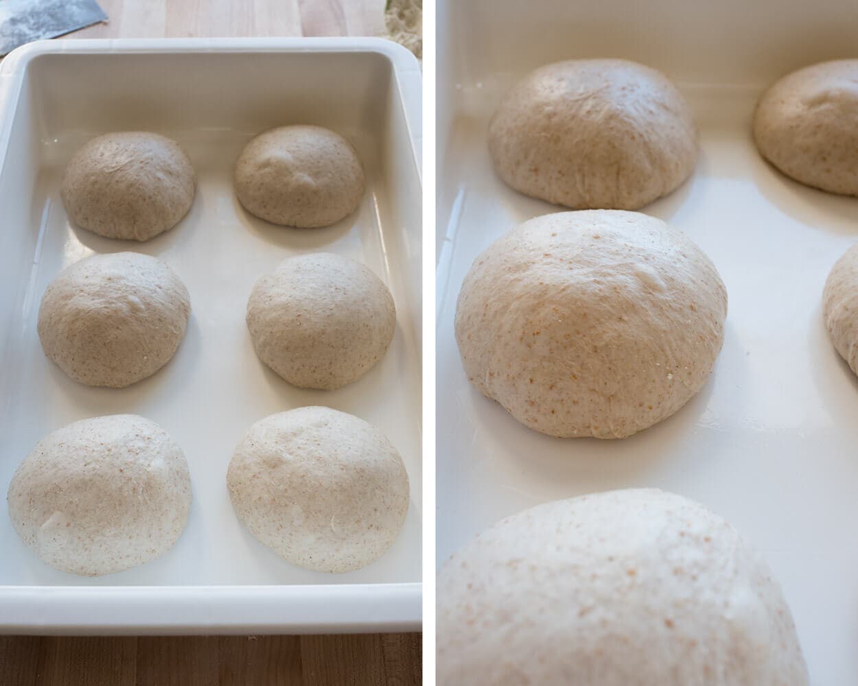Pick a container to hold your shaped dough balls. With only two, you can use a small baking sheet (like a quarter sheet), or, even better, a high-walled baking dish. I like to use large containers specifically designed to proof pizza dough.