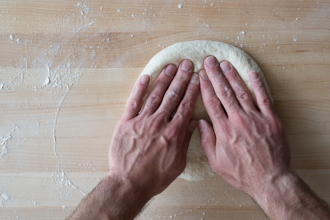Divide the dough into two 290g dough balls and, using almost no flour, form each into a very tight ball. It’s incredibly important to create a ball with a completely closed bottom with no seam. You want a tight skin on each of these surrounding the dough ball.